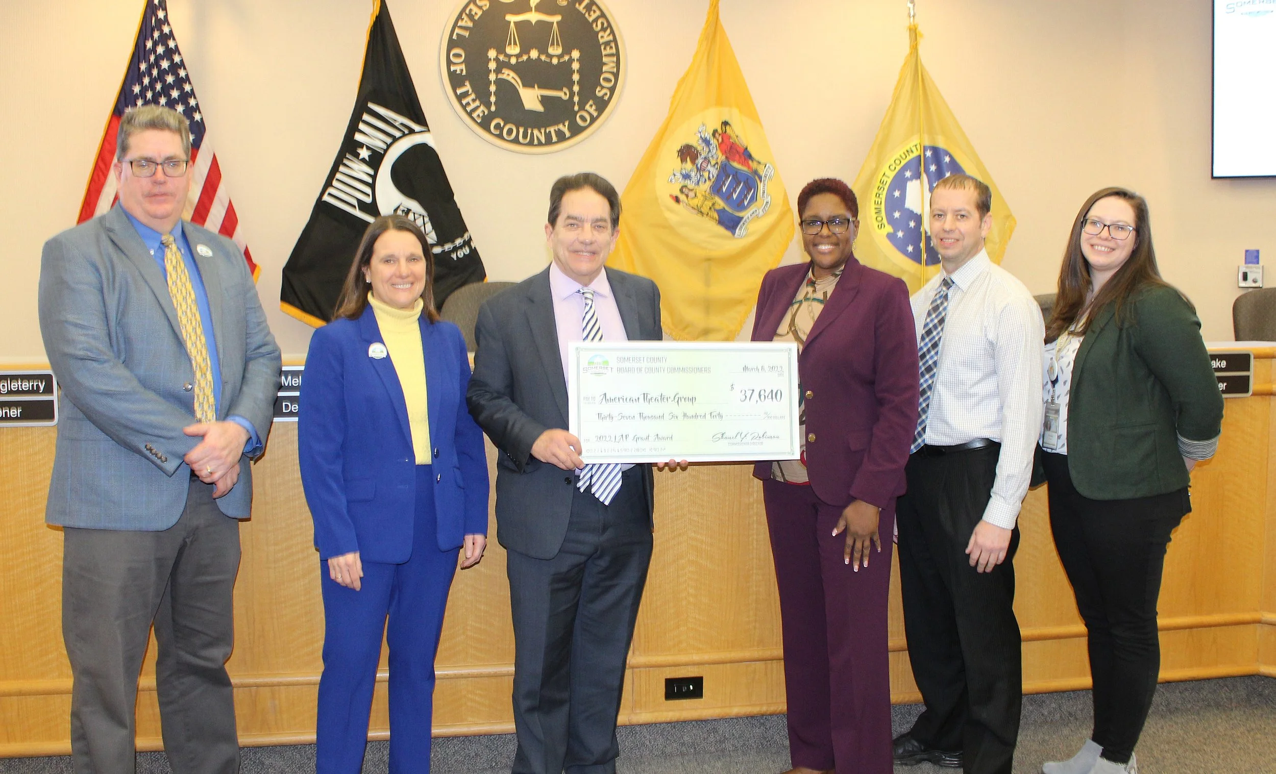 ATG was proudly awarded a $37,640 grant from the Somerset County Cultural and Heritage Commission in March, 2022. “We are thrilled that the innovative and celebrated productions and educational programs that ATG produces are being recognized by the County,” noted ATG Producing Artistic Director Jim Vagias. “These funds will help allow us to continue bringing outstanding theater to Somerset County and New Jersey residents.” Pictured from left: Commissioner Paul M. Drake, Commissioner Deputy Director Melonie Marano, Jim Vagias, Commissioner Director Shanel Y. Robinson, Commissioner Douglas Singleterry, and Somerset County Cultural & Heritage Commission Manager Kaitlin Bundy.